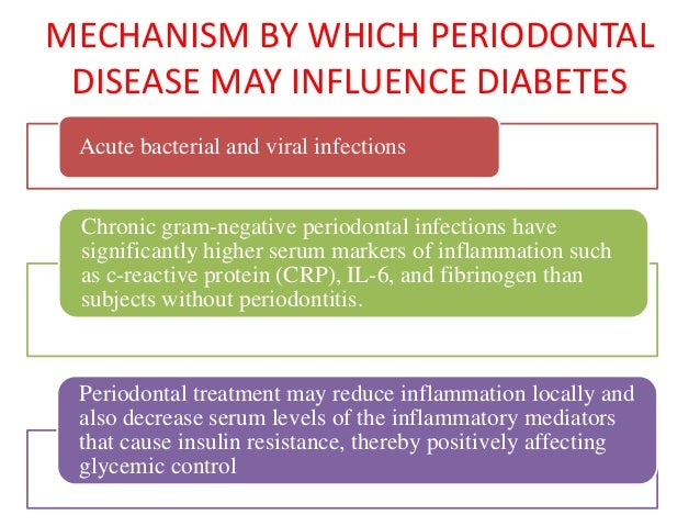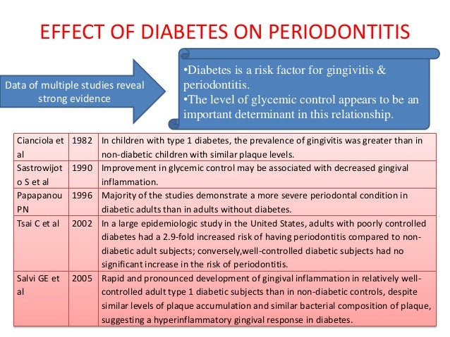 Controlled diabetes can have periodontal diseases just as patients with poorly controlled diabetes may have a healthy periodontium. Effect of diabetes on periodontitis data of multiple studies reveal strong evidence diabetes is a risk factor for gingivitis periodontitis. Effect of periodontal treatment on glycemic control of diabetic patients.